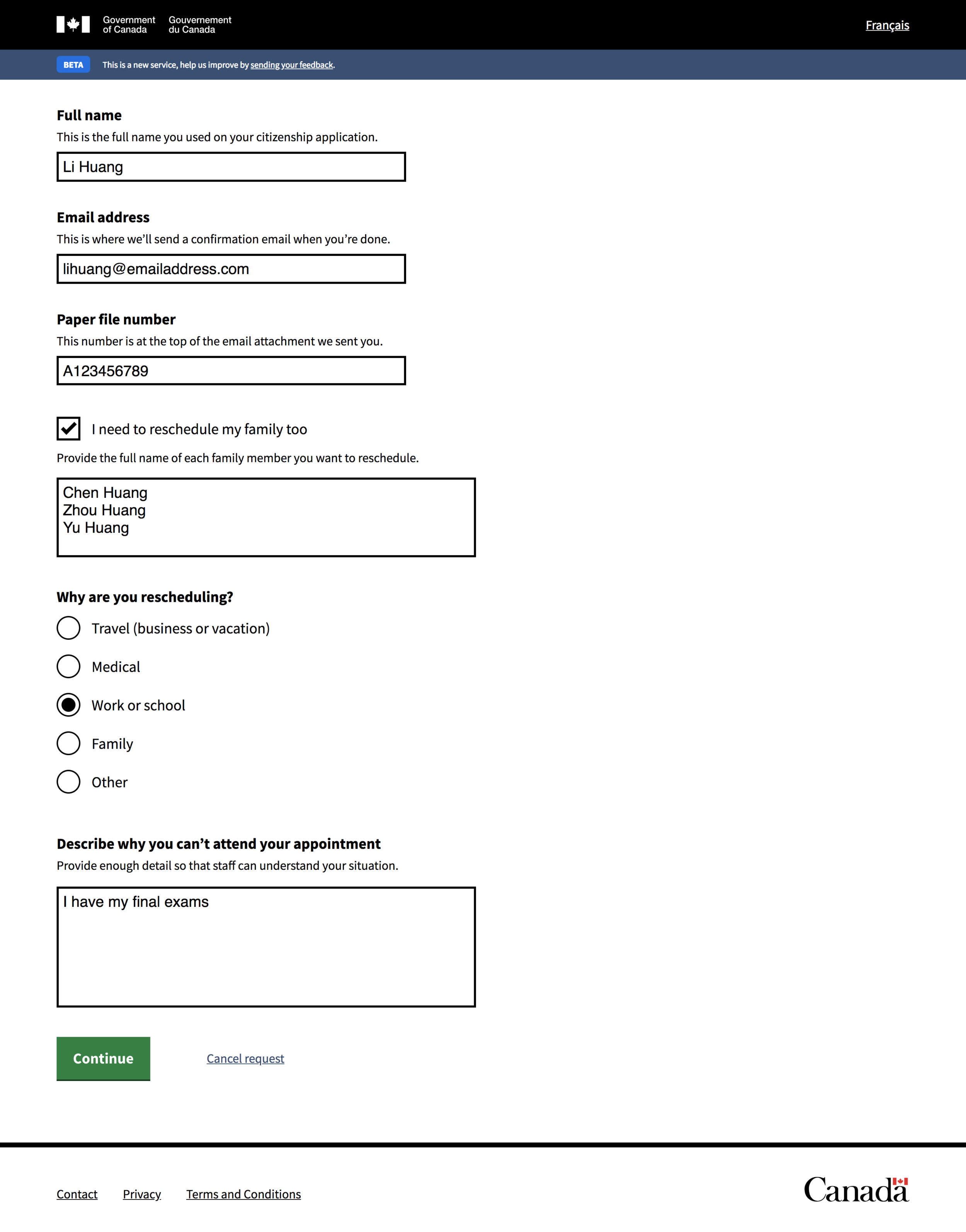 Now, when someone needs to reschedule their test, they follow the link in the email, or phone the call centre. Staff at the call centre are trained to use the online service on their behalf. We worked closely with the legal team at IRCC to get approval for staff to act as proxy, via consent given over the phone. Previously, consent could only be given in writing.